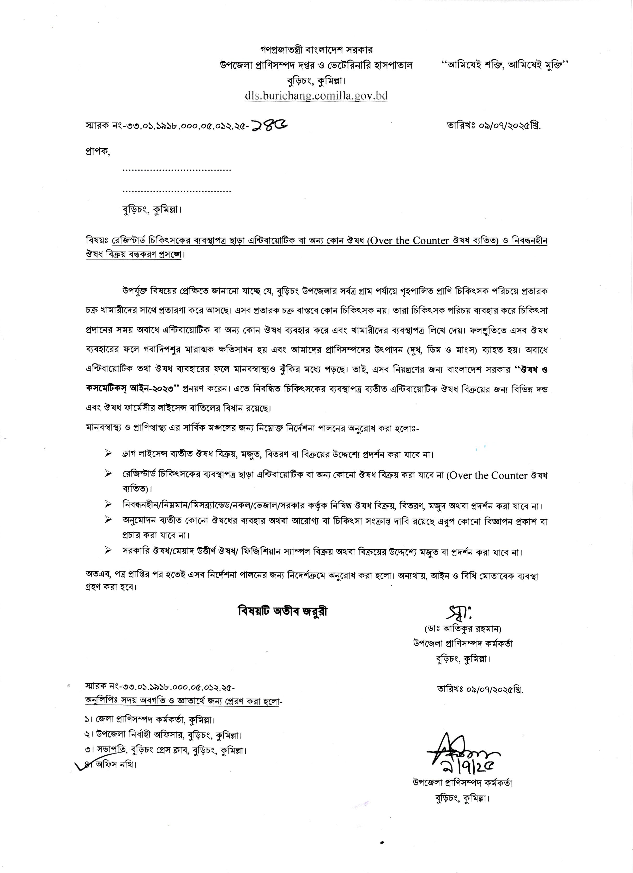 ১ আসন্ন ঈদুল ফিতর ২০২৬ উপলক্ষে ছুটিকালীন সময়ে সার্বক্ষনিক দায়িত্ব পালন প্রসঙ্গে ১৬-০৩-২০২৬ দেখুন ২ বর্তমান সরকারের নির্বাচনী ইশতেহার ভিত্তিক কর্মপরিকল্পনা বাস্তবায়নের নিমিত্তে গবাদিপশু ও পোল্ট্রি খামারের বিভিন্ন ক্যাটাগরির শ্রেণি ভিত্তিক খামারের হালানাগাদ তথ্যাদির সংগ্রহ প্রসঙ্গে। ০৪-০৩-২০২৬ দেখুন ৩ জাতীয় প্রাণিসম্পদ সপ্তাহ ২০২৫ উপলক্ষে গণবিজ্ঞপ্তি ১৬-১১-২০২৫ দেখুন ৪ রেজিস্টার্ড চিকিৎসকের ব্যবস্থাপত্র ছাড়া এন্টিবায়োটিক বা অন্য কোন ঔষধ (Over the Counter ঔষধ ব্যতিত) ও নিবন্ধনহীন ঔষধ বিক্রয় বন্ধকরণ প্রসঙ্গে। ০৯-০৭-২০২৫ দেখুন ৫ বন্যা কবলিত এবং বন্যা পরবর্তী গবাদিপশু ও হাঁস-মুরগির সুরক্ষায় কৃষক/খামারি ভাইদের জন্য করণীয় ০৬-০৭-২০২৫ দেখুন ৬ ২০২৪-২০২৫ অর্থবছরে ই-গভর্নেন্স, অভিযোগ প্রতিকার ও তথ্য অধিকার সংক্রান্ত প্রশিক্ষণ সূচিসমূহ। ১২-১২-২০২৪ দেখুন ৭ ২০২৪-২০২৫ অর্থবছরে কর্মপরিবেশ উন্নয়ন সম্পর্কিত সভার বিবরণী। ১২-১২-২০২৪ দেখুন ৮ ২০২৪-২০২৪ অর্থবছরে ই-গভর্নেন্স, অভিযোগ প্রতিকার ও তথ্য অধিকার সংক্রান্ত প্রশিক্ষণ নোটিশ। ০৩-১২-২০২৪ দেখুন ৯ ২০২৪-২০২৫ অর্থবছরে কর্মপরিবেশ উন্নয়ন সম্পর্কিত সভার নোটিশ। ০৩-১২-২০২৪ দেখুন ১০ ২০২৪-২০২৫ অর্থবছরে সেবা প্রদান প্রতিশ্রুতি বিষয়ে সেবাগ্রহীতাদের অবহিতকরণ সংক্রান্ত ২য় সভার কার্যবিবরণী। ০৩-১২-২০২৪ দেখুন